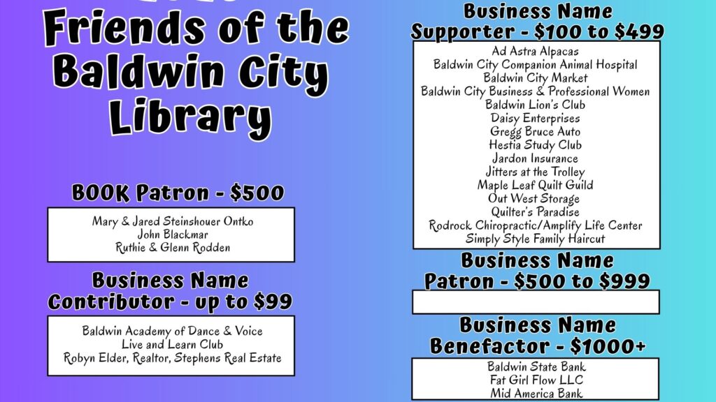 The Friends of the Baldwin City Library organization was established in 1986 to help raise funds, promote publicity and help the progress of the library. If you’re interested in joining the friends, fill out the Online Membership Form and pay securely online, or print out and send in the Printable Membership Form.